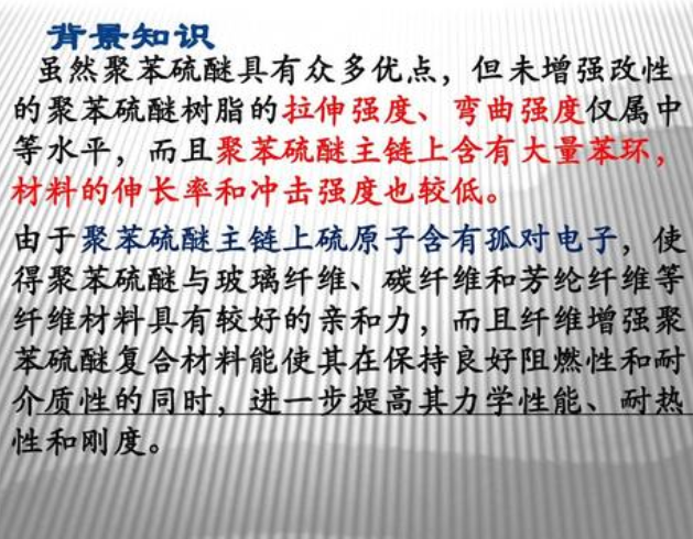 聚苯硫醚PPS是一种综合性能优异的特种工程塑料。其具有优良的耐高温、耐腐蚀、耐辐射、阻燃、均衡的物理机械性能和极好的尺寸稳定性以及优良的电性能等特点,被广泛用作结构性高分子材料。但是因为纯的聚苯硫醚性能脆而很少被单独使用,PPS的实际应用多以复合材料的形式出现,通过增强、改性等处理后的PPS成为“六大”特种工程塑料之一。其中,碳纤维增强PPS就是较为常见的一种应用形式。